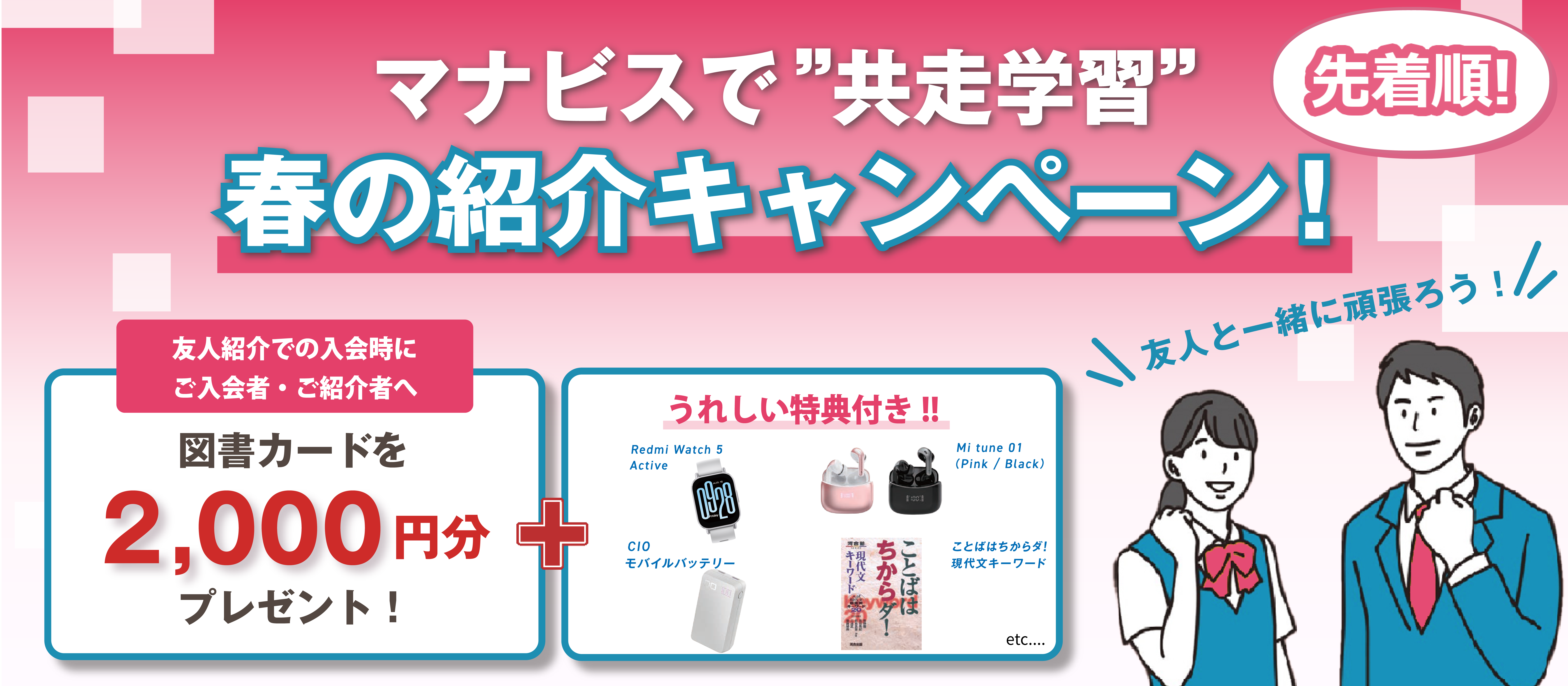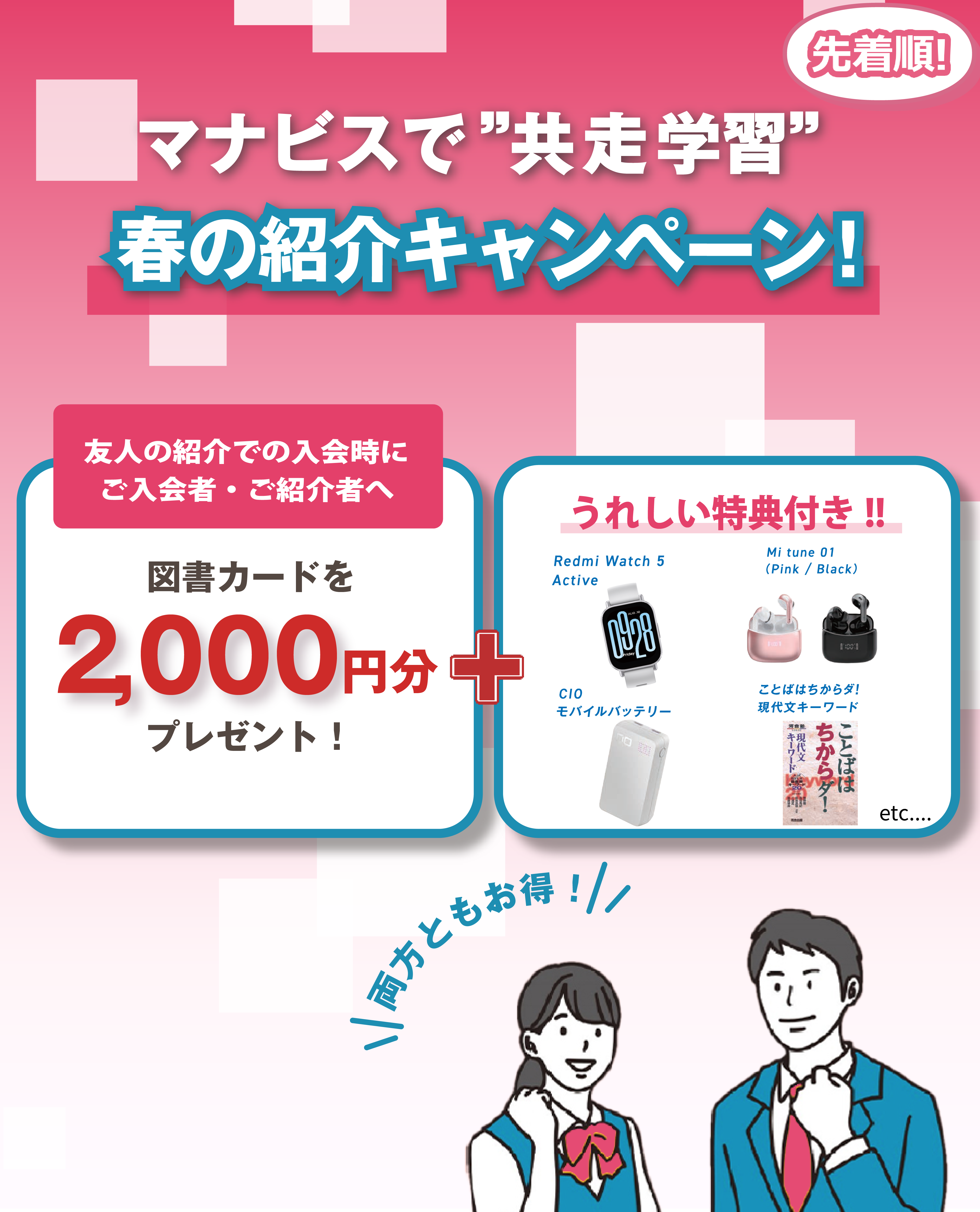高1・2・3生、中高一貫校新中3生・マナビス生やその保護者の紹介(紹介者)およびそのご紹介で入会された方(入会者)・ご友人同士でご入会された方